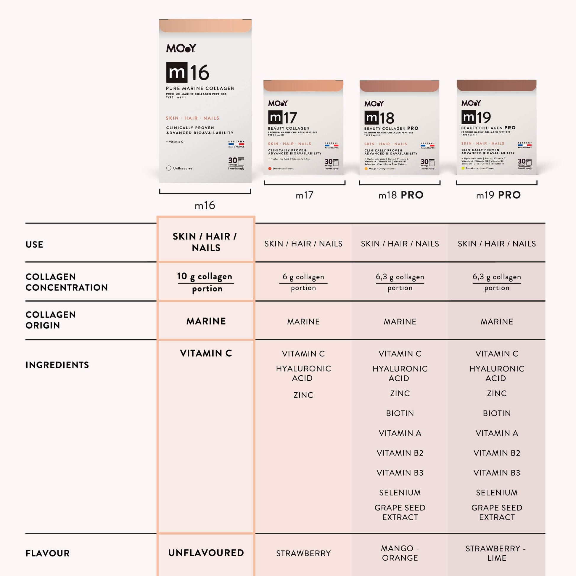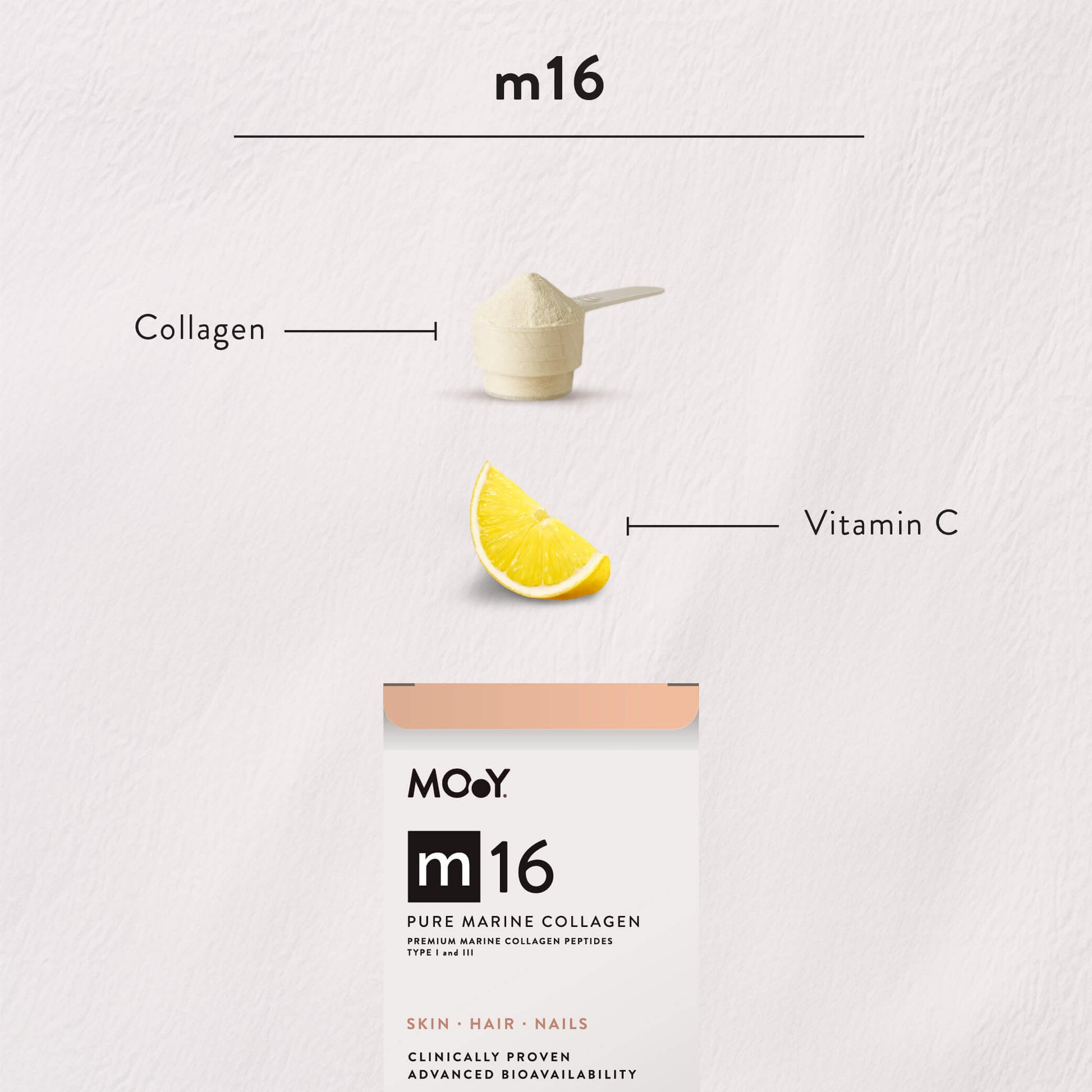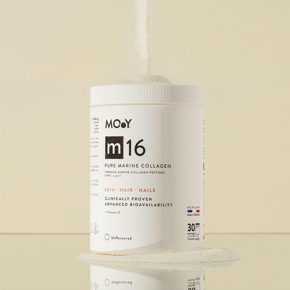 m16 Pure Marine Collagen & Vitamin C formula features clinically tested hydrolyzed collagen sourced from France, enhanced with vitamin C. Our collagen peptides undergo a meticulous enzymatic fragmentation process, ensuring maximum bioavailability and absorption in the human body.