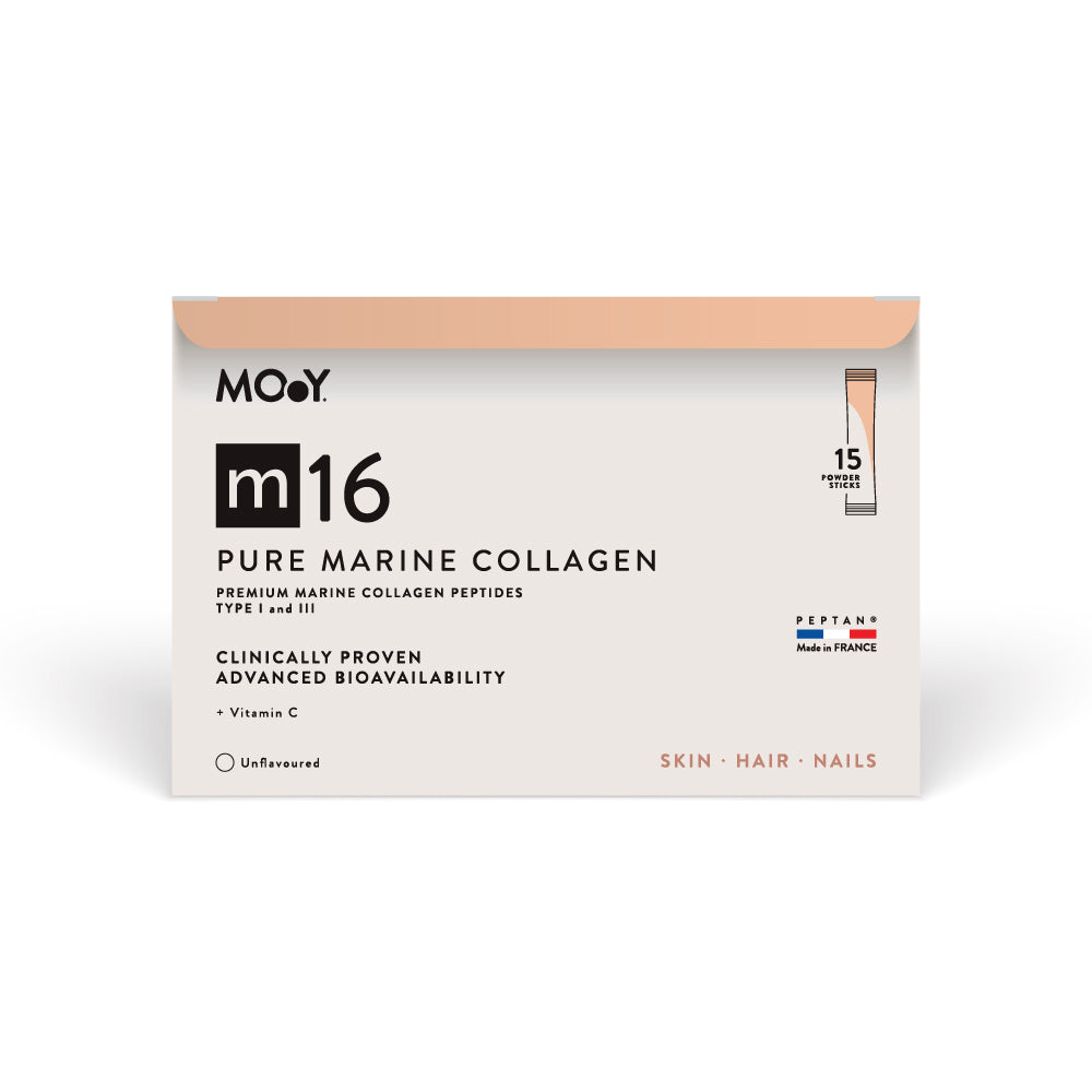 The m16 Pure Marine Collagen & Vitamin C Powder Stick features 10,000 mg of clinically proven PEPTAN® hydrolyzed collagen peptides sourced from France, enhanced with vitamin C. Our collagen peptides undergo a meticulous enzymatic fragmentation process, ensuring maximum bioavailability and optimal absorption in the human body.