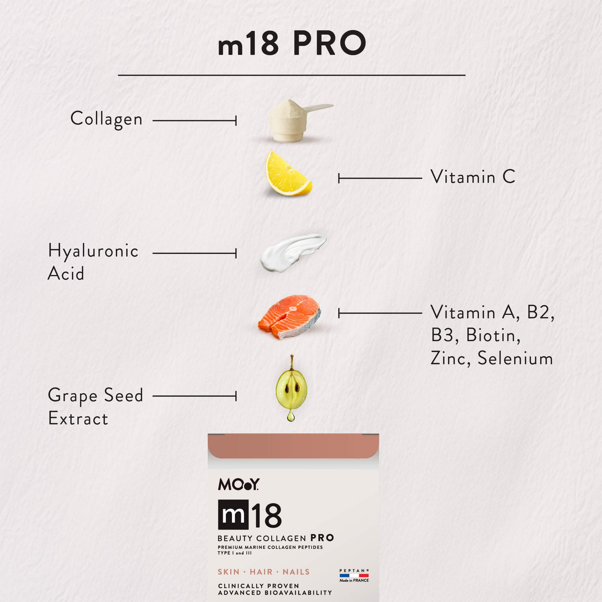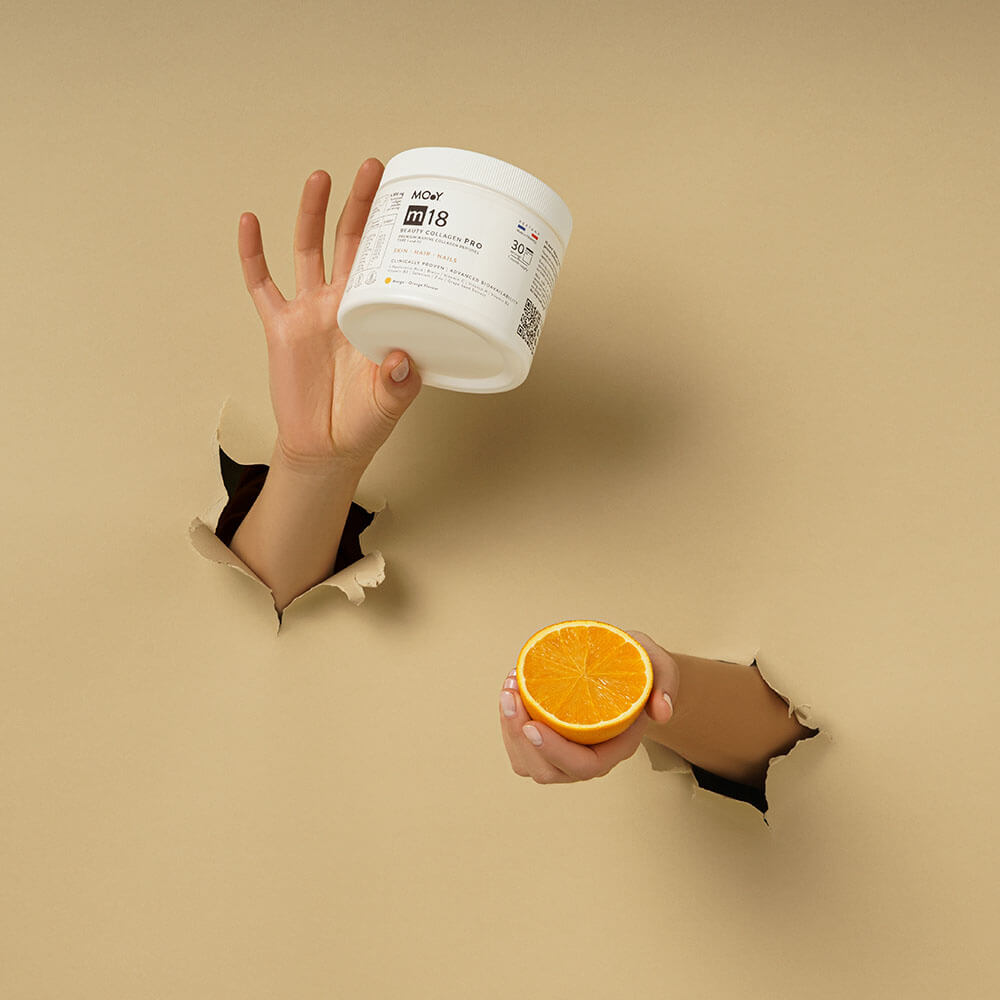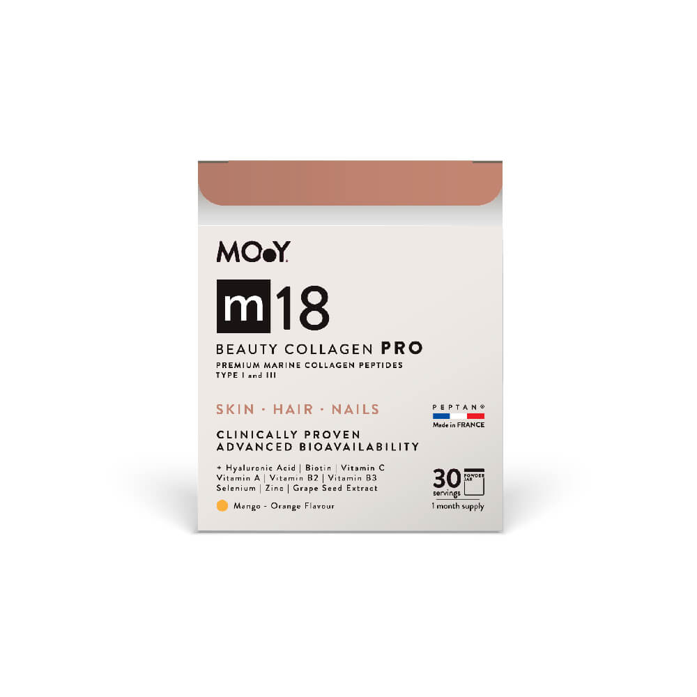 m18 Beauty Collagen PRO Mango Orange formula features clinically tested hydrolysed collagen sourced from France, enhanced with hyaluronic acid, vitamins C, A, B2, B3, biotin, zinc and selenium minerals together with mango - orange flavour. Our collagen peptides undergo a meticulous enzymatic fragmentation process, ensuring maximum bioavailability and absorption in the human body.