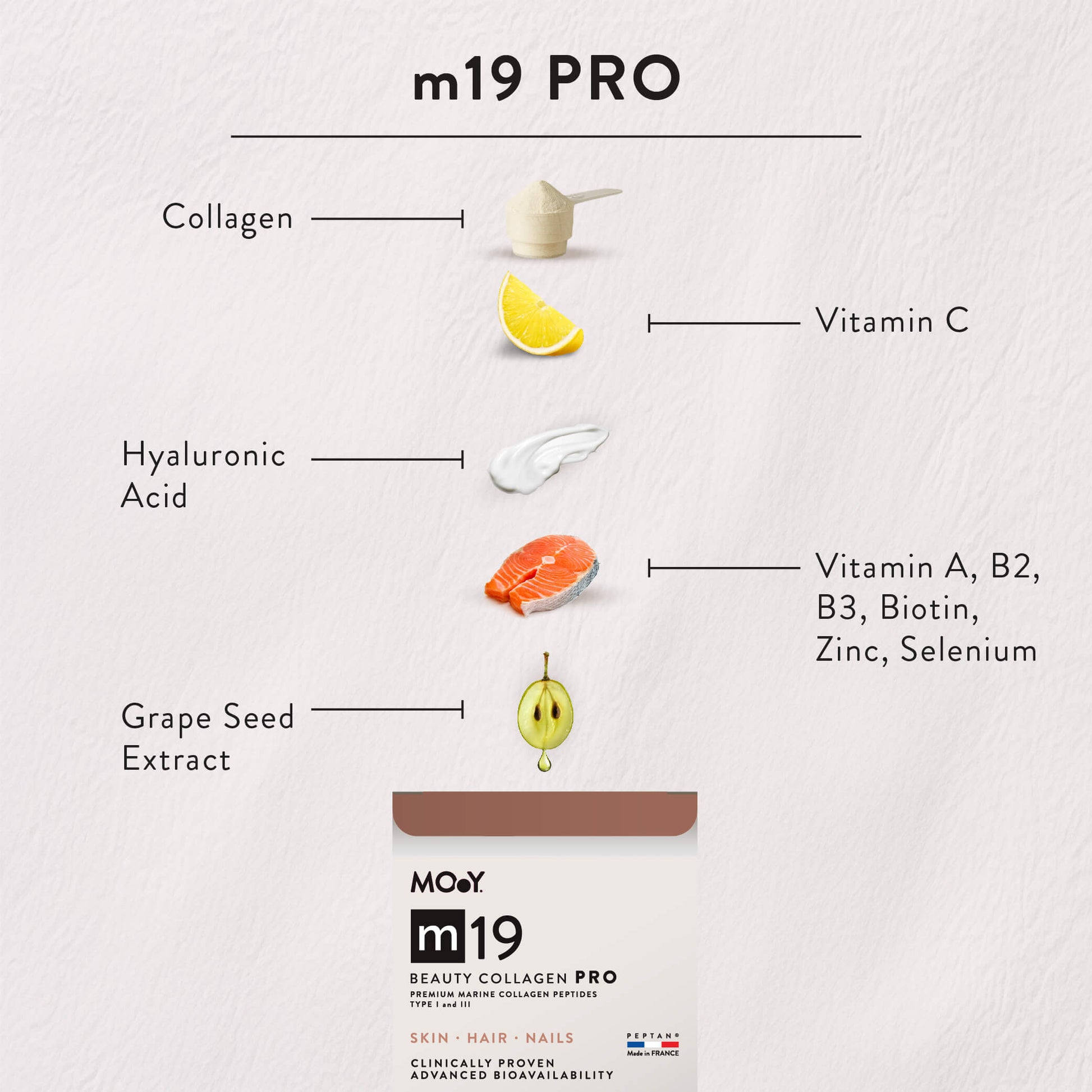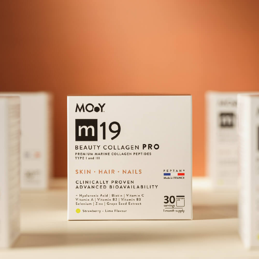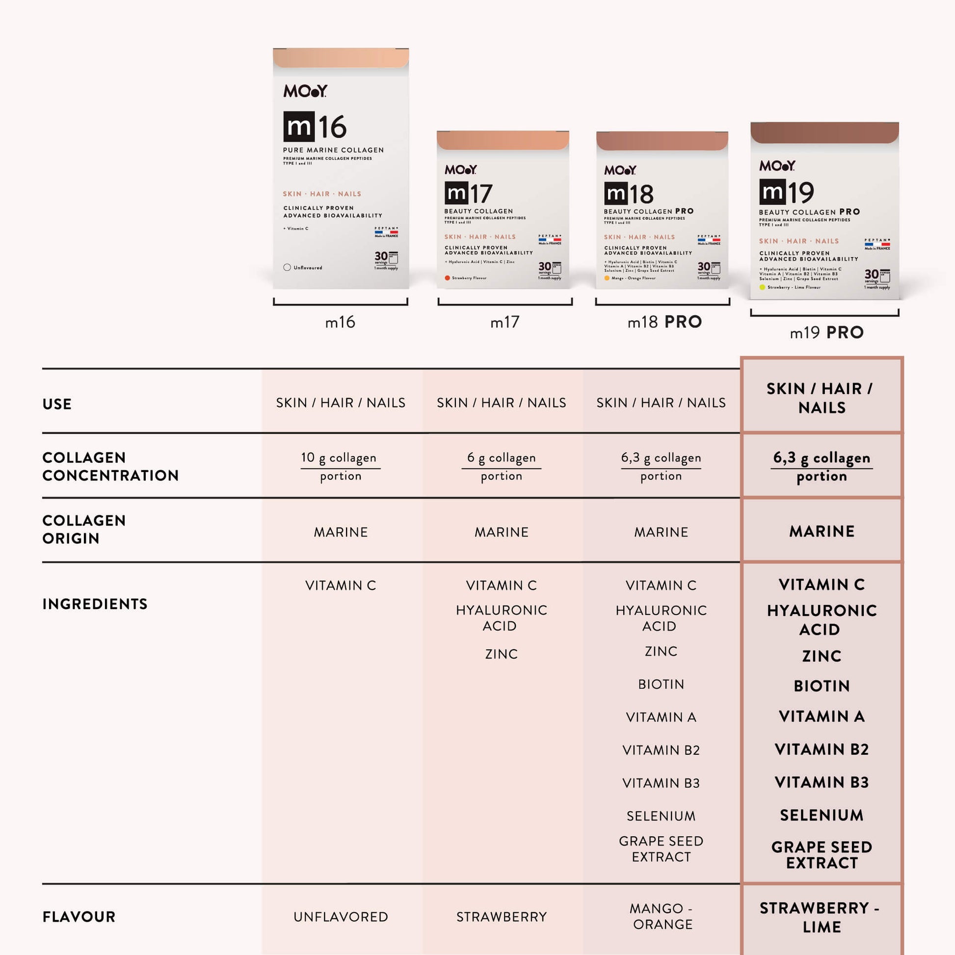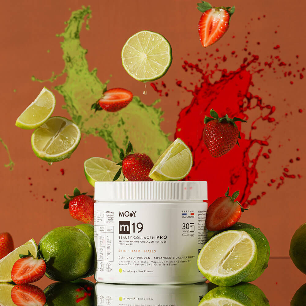 m19 Beauty Collagen PRO Strawberry Lime formula features clinically tested hydrolysed collagen sourced from France, enhanced with hyaluronic acid, vitamins C, A, B2, B3, biotin, zinc and selenium minerals together with with strawberry - lime flavour. Our collagen peptides undergo a meticulous enzymatic fragmentation process, ensuring maximum bioavailability and absorption in the human body.